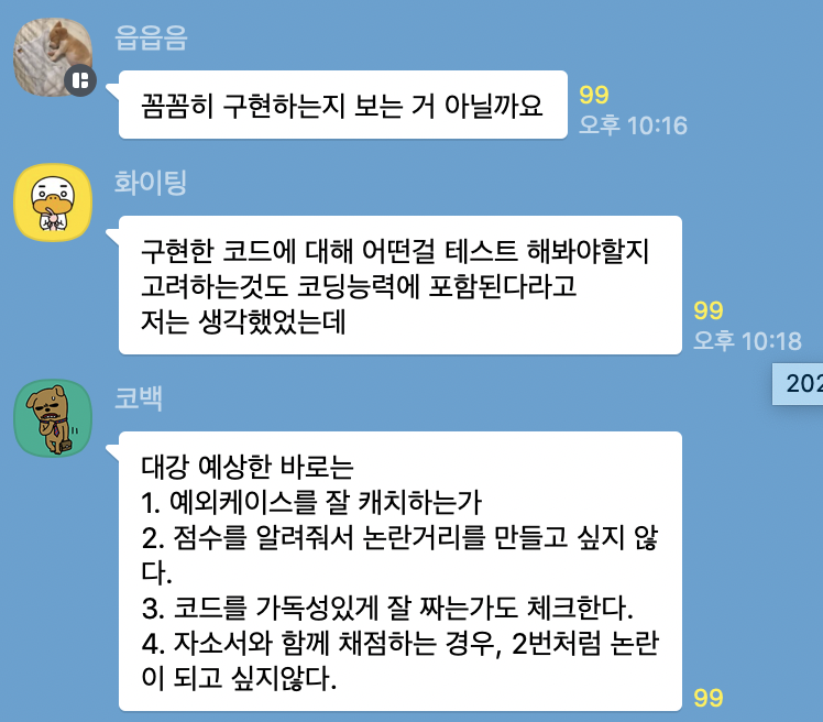 그래서 오픈 채팅방에 물어본 적이 있는데, 얼마나 꼼곰하게 고민하고 구현해내는지를 보기 위함이라는 이유가 제일 와닿았다. 오늘 치룬 코테도 그러했다.
